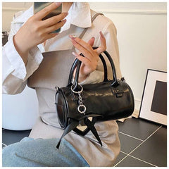 تتميز هذه الحقيبة الأسطوانية الأنيقة بتصميم منظم مع مقبض علوي وإغلاق بسحاب، وتزدان بسلسلة مفاتيح رقيقة على شكل فيونكة بيضاء مع حلقة معدنية.