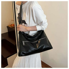 تتميز هذه الحقيبة الكتفية الجلدية السوداء الواسعة بتصميم أنيق ذي ملمس مميز، مع سحاب فضي بارز في الأمام يضفي عليها لمسة عصرية. صُممت هذه الحقيبة لتجمع بين الأناقة والعملية، فهي توفر مساحة واسعة للأغراض اليومية، وتُعد مثالية للنزهات غير الرسمية أو السفر. يضمن حزامها المتين حملًا مريحًا، مما يجعلها إضافة متعددة الاستخدامات لأي خزانة ملابس.