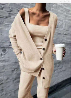 استمتعي بالراحة والأناقة مع طقم الاسترخاء الأنيق هذا المصنوع من قماش التريكو البيج. يتألف الطقم من كارديجان ناعم وواسع بأزرار كبيرة، مثالي لارتدائه فوق توب داخلي ضيق مطابق. ويكمل البنطال ذو القصة المريحة الإطلالة المتناسقة، ليخلق زيًا أنيقًا ومريحًا في الوقت نفسه، مثاليًا للأيام العادية، والاسترخاء، أو قضاء المشاوير.
