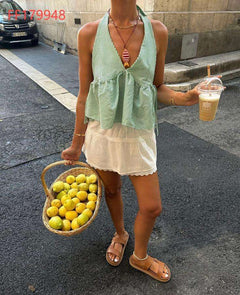 تتميز هذه الإطلالة الصيفية المنعشة ببلوزة قصيرة مخططة باللونين الأخضر والأبيض مع ربطة أمامية، مما يوفر مظهرًا منعشًا ومرحًا
