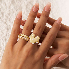 أضيفي لمسة من الأناقة والجاذبية إلى مجموعتكِ من المجوهرات مع هذه المجموعة الرائعة من الخواتم المطلية بالذهب. تتميز بخاتم جريء على شكل قلب مزين بلمسات رقيقة من اللؤلؤ، مع خاتم متناسق مرصع باللؤلؤ، مما يضفي على هذه المجموعة لمسة من الرقي والأنوثة.