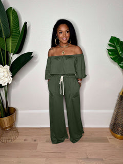Off-Shoulder Pants & Crop Top Set - S, Army Green image