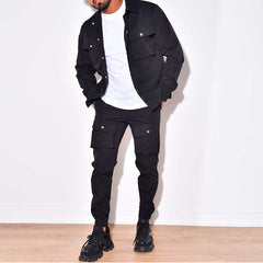 طقم رجالي مكون من قطعتين: جاكيت بأكمام طويلة وأزرار أمامية وجيوب على الصدر، وبنطال برباط وجيوب متعددة، مناسب للأنشطة الخارجية.