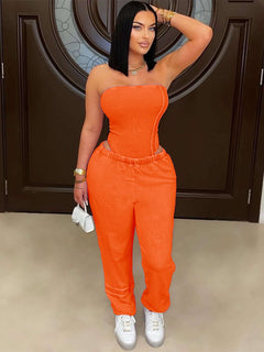 تألقي بإطلالة جريئة وأنيقة مع هذا الطقم المكون من قطعتين بدون حمالات باللون البرتقالي النابض بالحياة. يتألف الطقم من توب ضيق بتصميم باندو يُبرز جمال قوامك، وبنطال رياضي عالي الخصر مصمم خصيصاً ليجمع بين الراحة والأناقة.