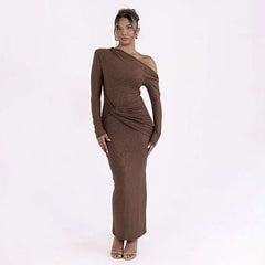 هذا الفستان النسائي ذو الرقبة غير المتماثلة والأكمام الطويلة المكشكشة، وهو فستان ماكسي لامع مثالي لحفلات السهرة