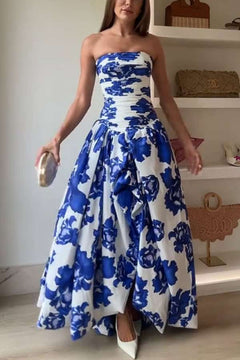 يتميز هذا الفستان الرائع بدون حمالات بطبعة زهور زرقاء وبيضاء نابضة بالحياة، مع صدرية ضيقة مكشكشة تبرز الخصر. تنسدل التنورة الواسعة لتشكل قصة طويلة أنيقة، مثالية للمناسبات الرسمية، والحفلات، أو المناسبات الخاصة.