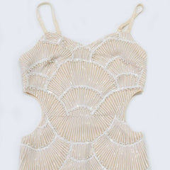 تألقي بأناقة خالدة مع هذا الفستان الأبيض الميدي الرائع المطرز بالخرز، والذي يتميز بتطريز دقيق على شكل صدفة يضفي عليه ملمساً وبريقاً مميزين. يُبرز التصميم الأنيق جمال قوامك بفضل الفتحات الجانبية الرقيقة وحمالات الكتف الرفيعة، ليخلق توازناً مثالياً بين الرقي والجاذبية.