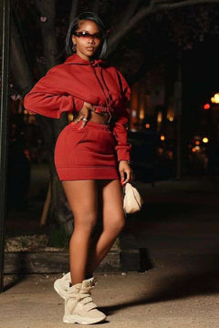 Solid Drawstring Crop Hoodie and Mini Skirt - M, Red image