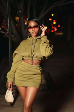 Solid Drawstring Crop Hoodie and Mini Skirt - M, Army Green image
