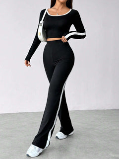 طقم نسائي مكون من قطعتين، بلوزة قصيرة بأكمام طويلة وبنطال.