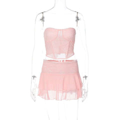 يتميز هذا الطقم الأنيق المكون من قطعتين باللون الكريمي بتوب من الدانتيل بدون حمالات بتفاصيل دقيقة، مع تنورة شفافة متناسقة.