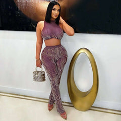 تألقي بإطلالة ساحرة مع هذه المجموعة الأنيقة المكونة من قطعتين، والتي تضم توب قصير بدون أكمام بياقة عالية وبنطالاً عالي الخصر متناسقاً. يتميز قماش الشبك الشفاف بنقشة دوامية أنيقة بألوان الموف الهادئة واللمسات المعدنية، مما يخلق مظهراً فاخراً وجذاباً.