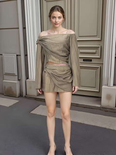 يتميز هذا الطقم الأنيق ذو اللون البيج المخطط بتصميم غير متماثل، يتألف من بلوزة مكشوفة الكتفين بتصميم منسدل وتنورة قصيرة متناسقة. تتميز البلوزة بتفاصيل إبزيم فريدة على الكتف، مما يضفي لمسة عصرية، بينما تبرز التنورة بقماشها المنسدل والمُجمّع لإطلالة أنيقة. يُعد هذا الطقم مثاليًا لإطلالة عصرية أو مناسبة أنيقة، فهو يجمع بين الرقي والأناقة المعاصرة.