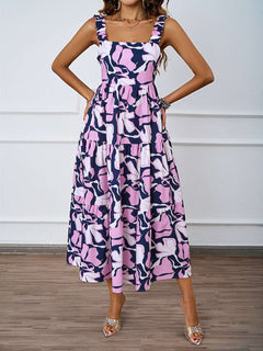 أضيفي لمسة استوائية إلى خزانتكِ مع هذا الفستان الميدي الجذاب بنقشة أوراق استوائية بألوان زاهية من الأخضر والوردي. يتميز الفستان بتصميم أنيق مع حمالات مكشكشة وفتحة رقبة مربعة، ويمنحكِ قصة متدرجة رائعة تضفي عليكِ انسيابيةً مع كل خطوة.