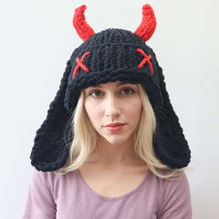 Add a playful and whimsical touch to your wardrobe with this adorable white crocheted hat featuring black devil horns. The hat is designed with a cozy, textured crochet pattern and includes fun black horns on top, making it perfect for costume parties, themed events, or simply expressing your quirky style.