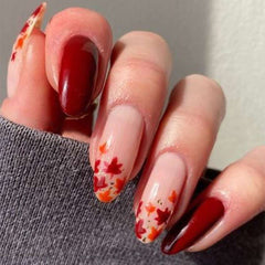 This stunning manicure features a sophisticated combination of deep red, glossy nails paired with delicate, semi-transparent nails decorated with vibrant red and orange floral designs. The contrasting styles create a chic and seasonal look, perfect for autumn gatherings or everyday elegance.