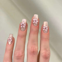 This sophisticated manicure features a neutral base with beautifully crafted 3D flower embellishments on each nail. The delicate pink flowers add a touch of femininity and elegance, perfect for special occasions or everyday glamour. The detailed design showcases a blend of subtlety and intricate artistry, making these nails a stunning accessory to any look.