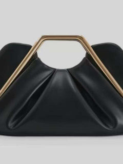 This stylish handbag features a unique twisted design with a sophisticated gold geometric handle. Crafted from high-quality faux leather, it offers a sleek and modern look perfect for both casual and formal occasions
