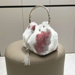 This stylish handbag features a soft faux fur exterior in white with maroon accents, offering a cozy yet fashionable look. The bag is adorned with silver-tone chain embellishments and metallic accents, including a decorative tassel detail that adds a touch of elegance.