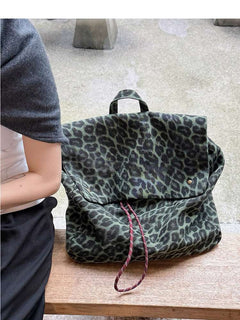 This stylish travel backpack features a bold leopard print design, offering both fashion and functionality. It comes with a spacious main compartment secured by a drawstring closure, a front flap with snap buttons for added security, and sturdy top handles for easy carrying.