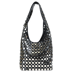 Add a touch of edgy chic to your accessories collection with this perforated tote bag. Crafted from durable faux leather, it features a unique pattern of circular cut-outs that create a striking visual effect. Perfect for everyday use or a night out, this spacious bag combines practicality with fashion-forward design, making it a versatile addition to any wardrobe.