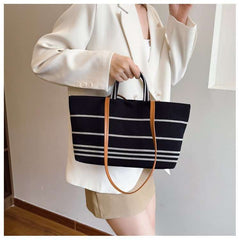 This chic tote bag features a classic black background with sleek white horizontal stripes, offering a timeless and versatile accessory for everyday use. Crafted for durability and style, it includes sturdy handles and a spacious interior, perfect for carrying essentials, groceries, or beach gear. Whether heading to work, shopping, or a casual outing, this tote adds a touch of sophistication and practicality to your look.