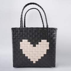 Make a stylish statement with this chic tote bag featuring a striking heart design in contrasting beige tones. Crafted from durable, high-quality materials, this spacious bag is perfect for everyday use, shopping, or casual outings. The intricate woven pattern adds a touch of elegance and texture, while the sturdy handles ensure comfortable carrying. Elevate your accessory game with this fashionable and functional tote.