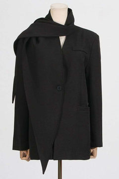 It is bold and contemporary. The asymmetric cape panel adds a dramatic touch, while the metallic button fastening elevates the design. This blazer is versatile and can be dressed up or down.