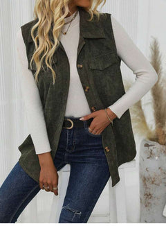A timeless piece for the modern minimalist. Crafted from soft corduroy, this sleeveless vest adds a touch of texture and warmth to any outfit. Its button-down front and structured collar exude effortless style, while the relaxed fit allows you to move with ease. Pair it with a long-sleeve knit top and your favorite jeans for a look that's casual yet chic, perfect for those laid-back days with a hint of sophistication.