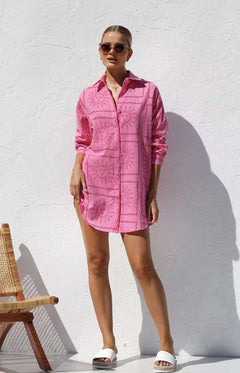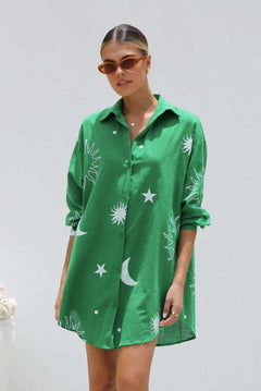 A stylish green button-down dress featuring a celestial print with white sun, moon, and star designs. Made from lightweight fabric, this dress offers a relaxed fit with long sleeves that can be rolled up, a collared neckline, and a knee-length hem