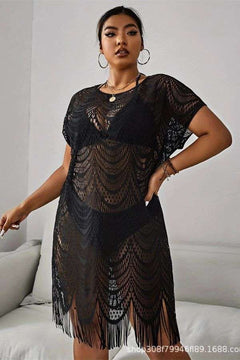 Elevate your beach or poolside look with this chic plus size black cover-up dress, featuring an elegant scalloped lace pattern and dramatic fringe trim. The relaxed, airy silhouette is designed to flatter with effortless ease, while the sheer fabric offers a stylish peek at your swimwear underneath.