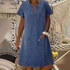 This casual denim T-shirt dress blends comfort and style with its relaxed fit and short sleeves. Designed with a flattering notched V-neckline and two practical front patch pockets, it's perfect for laid-back days or casual outings.
