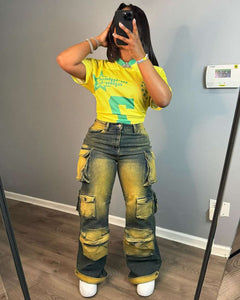 Step up your fashion game with these stylish cargo jeans featuring a striking yellow and black gradient. Designed with multiple pockets for practicality and a relaxed fit for comfort, these jeans are perfect for a casual, edgy look. Made from durable denim, they combine functionality with a bold, modern style. Ideal for streetwear or a laid-back day out.
