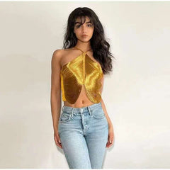 Elevate your style with this eye-catching metallic silver halter crop top, featuring a bold and innovative design. The shimmering, textured fabric creates a futuristic look, perfect for parties, festivals, or night outs. The halter neckline and cropped cut highlight your shoulders and midriff, offering a chic and daring appeal. Pair it with high-waisted skirts or pants for a trendy and glamorous ensemble.