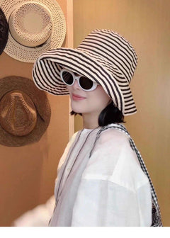 tay stylish and protected under the sun with this chic black and white striped wide-brim hat. Designed for both fashion and functionality, this hat features a classic striped pattern, a soft yet structured design, and a generously sized brim to provide ample sun protection.
