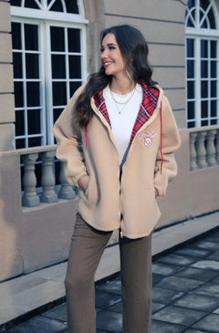 This stylish beige fleece jacket features a relaxed fit with a front zipper closure, two side pockets, and a playful embroidered patch on the chest. The jacket is layered over a red plaid hoodie for a casual, trendy look. Perfect for cool weather outings, it offers both comfort and fashion-forward appeal.