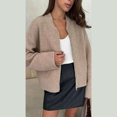 Stay comfortable and stylish with this cozy light grey knit sweater featuring a practical front zipper. Crafted from soft, warm material, it offers a relaxed fit with ribbed cuffs and hem for added comfort.