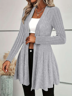 Add a touch of sophistication to your wardrobe with this stunning long knit cardigan. Featuring intricate textured patterns and a flattering flared hem, this versatile piece offers both warmth and style. Perfect for layering over your favorite outfits, it?s ideal for casual outings or more polished looks. Elevate your fall or winter wardrobe with this chic and cozy essential.