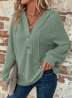 Women's hoodie sweatshirt with waffle, long sleeve, drawstring, V-neck, pullover hoodie, button front, shoulder drop, oversized version