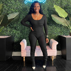 Sleek and versatile, this black ribbed jumpsuit is a must-have for effortless chic style. Designed with a scoop neckline and long sleeves, it features a figure-hugging silhouette that flatters your curves while providing comfort with its stretch ribbed fabric.