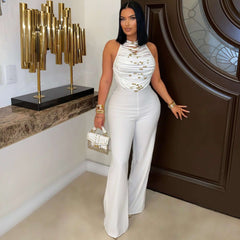 Make a bold statement in this all-black halter jumpsuit, designed for the confident woman who loves a touch of edge. The ruched bodice is adorned with striking metallic bead embellishments, creating an eye-catching texture and elevated glam.