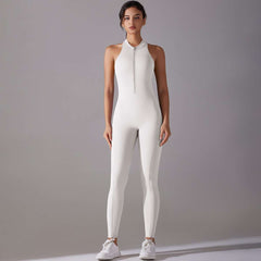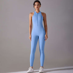 This stylish and functional sleeveless jumpsuit is perfect for activewear or casual outings. Made from a comfortable, stretchable fabric in a rich brown color, it features a high neckline with a front zipper for easy wear and adjustable ventilation.