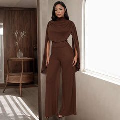 Make a sophisticated statement with this stunning cape-style set featuring flowing pleated sleeves and a high neckline. The fitted waist accentuates your figure, while the wide-leg pants add a touch of elegance and comfort.