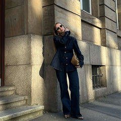 This timeless denim set features a structured dark denim shirt with a pointed collar, button-down front, and chest pockets, paired with matching straight-leg denim pants. Crafted from durable, high-quality denim, the ensemble offers a casual yet polished look suitable for everyday wear or relaxed outings.