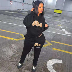 Upgrade your casual wardrobe with this comfortable black hoodie and matching joggers set, featuring adorable bear embroidery on both the hoodie and pants. Designed with a relaxed fit and soft fabric, it?s perfect for lounging or running errands. The hoodie has a stylish ripped detail on the sleeve, adding a trendy touch, while the joggers provide a snug fit with adjustable drawstrings. Complete your look with your favorite sneakers for effortless street style.
