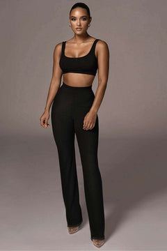 This two-piece set features a snug, cropped tank top and matching high-waisted trousers that create a sleek, streamlined silhouette. Made from a soft, breathable fabric, this set ensures both comfort and style, making it perfect for a range of occasions from casual outings to more festive gatherings. The elastic waistband offers a flexible fit, while the flowing pant legs move gracefully with every step.