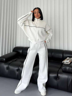 Striped Long Sleeved Zippered Jacket Set, leisure set for all day wear.