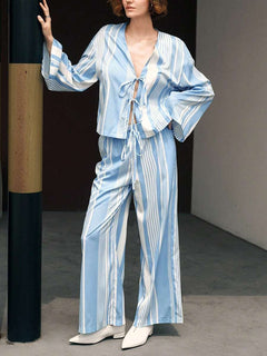 Elevate your loungewear collection with this chic blue and white striped two-piece set. The relaxed-fit top features a deep V-neckline with a front tie detail, adding a touch of femininity and flair. Matching wide-leg pants offer comfort and effortless style, making it perfect for lounging or casual outings. Crafted from lightweight, breathable fabric, this set combines comfort with modern elegance.
