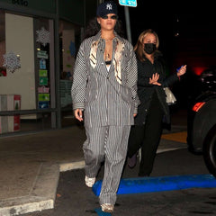 Make a bold fashion statement with this striking striped oversized shirt and matching pants set. The relaxed fit offers comfort and a chic, edgy look perfect for casual outings or street style. Featuring a classic button-up design with a slightly elongated silhouette, this coordinated ensemble is versatile and effortlessly stylish. Complete with leopard print shoes for a touch of personality.