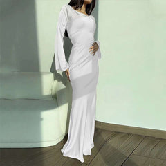 Make a stunning entrance with this elegant white satin evening dress. Featuring long, flowing sleeves and a sleek, form-fitting silhouette, this gown exudes sophistication and grace. Perfect for formal events, weddings, or special occasions, the smooth satin fabric adds a luxurious touch, while the timeless design ensures you'll look flawless from every angle.